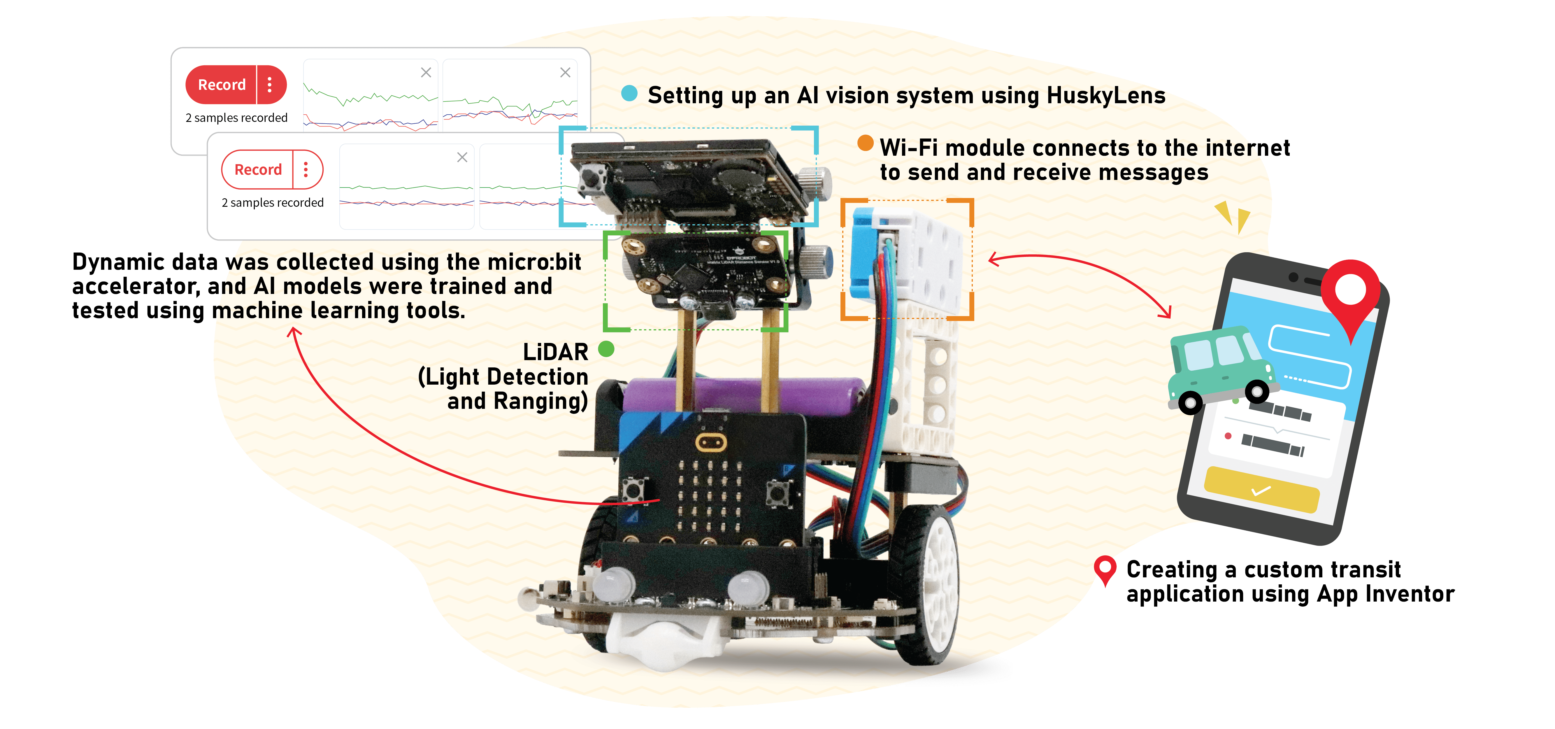 The course delves into the technical principles of LiDAR and its environmental sensing applications. By integrating AI vision systems for data analysis, students will train vehicles to recognize pedestrians, traffic signals, and obstacles. They will use micro:bit accelerometers to collect dynamic data, employ machine learning tools to train and test AI models, and integrate multi-source sensor data to achieve autonomous vehicle decision-making.